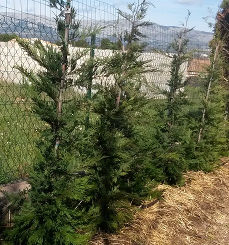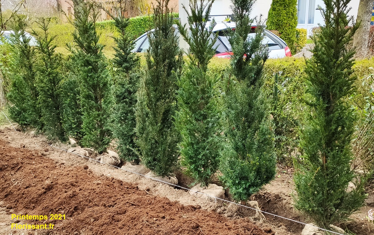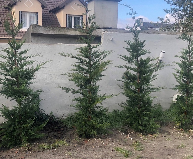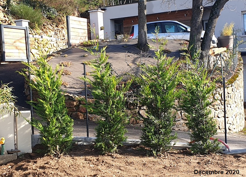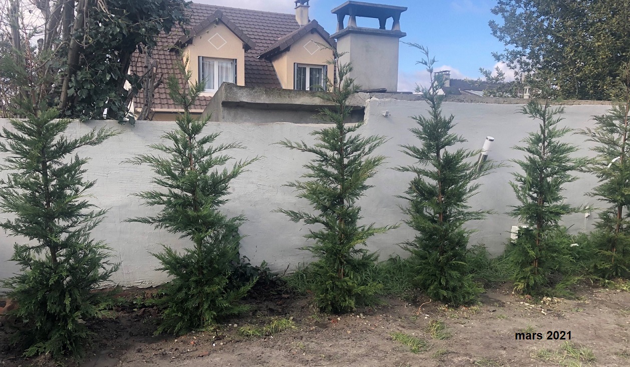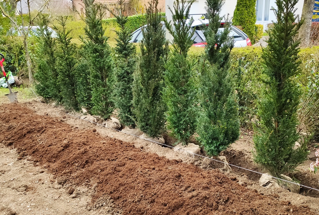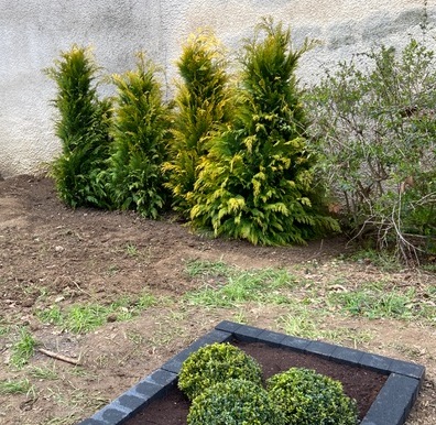 "Voici 2 photos de ma haie de Cyprès de Leyland 'Castlewellan Gold' sitôt arrives, sitôt plantée. Mon paysagiste les a trouvé parfaits !"