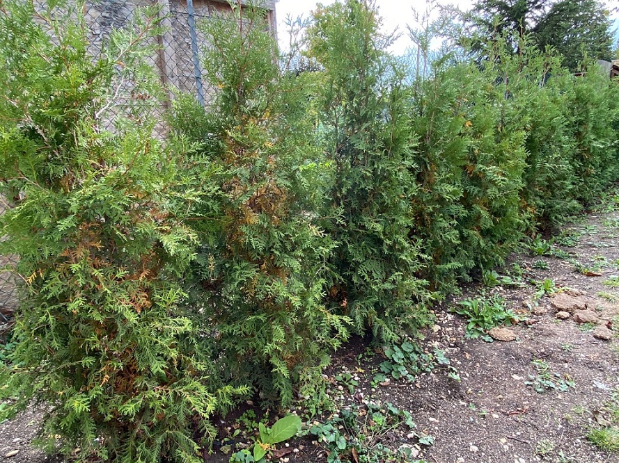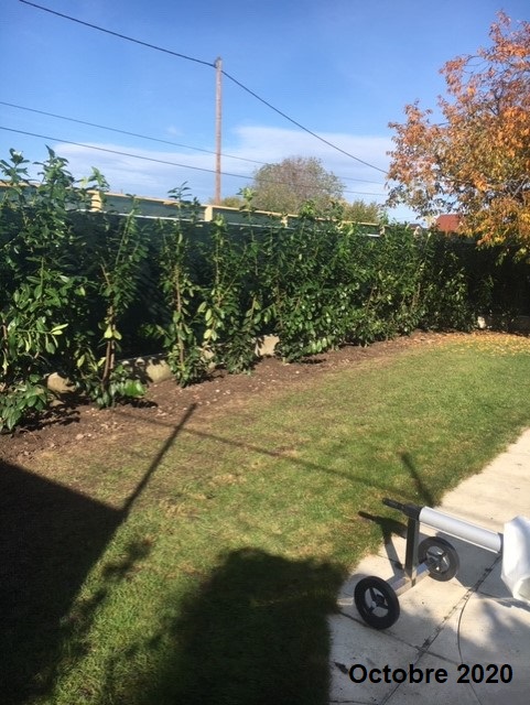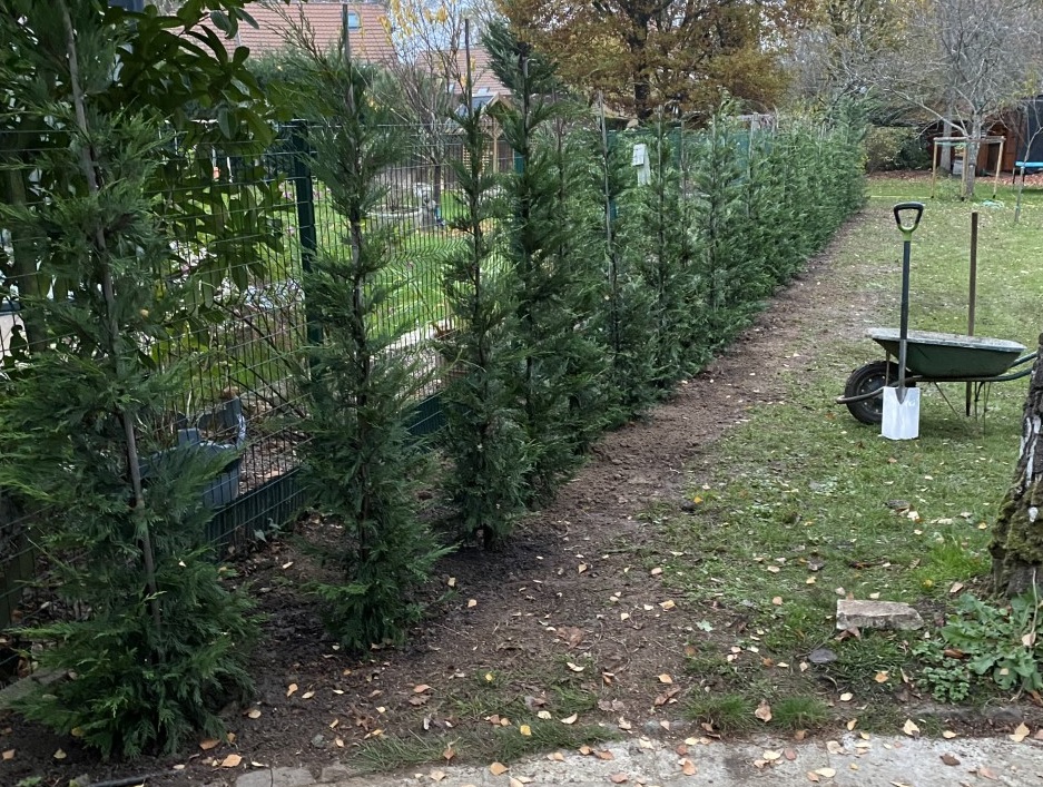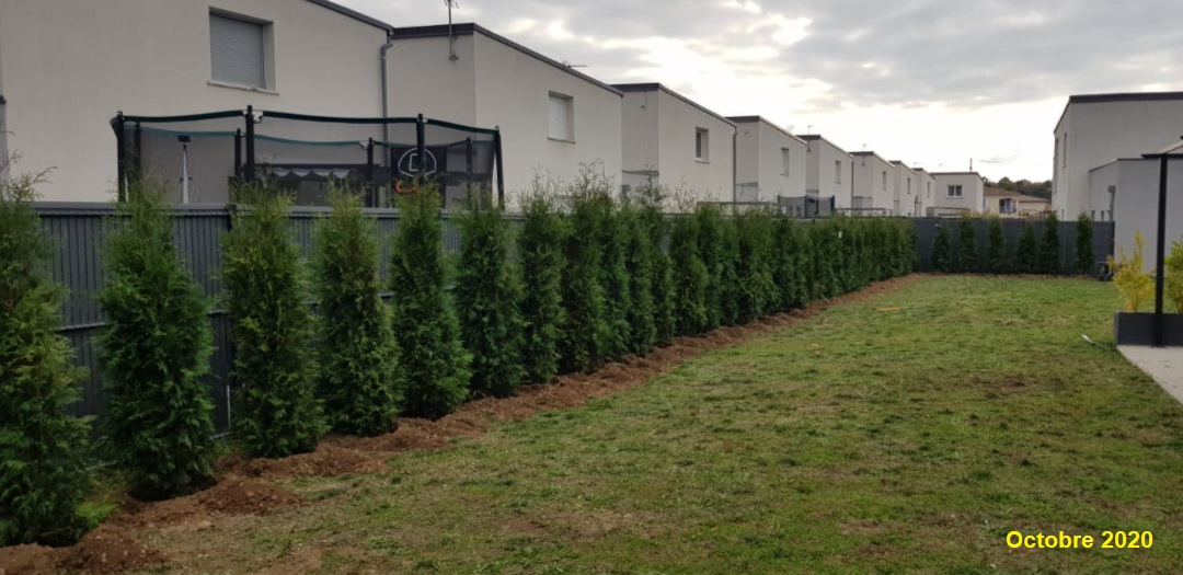 "Début octobre 2019, vous nous avez livré 25 Thuya du Canada 150/175 cm. Ces arbres ce sont très bien développés et ont grandi d’une trentaine de centimètres environ. Voici deux photos de notre haie dans son ensemble"