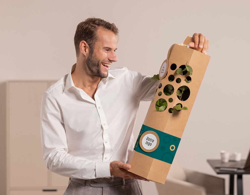 Chaque arbre est livré dans un bel emballage écologique, accompagné d’un message personnalisé et peut être imprimé avec votre logo. Un geste simple, mais fort, pour transmettre vos valeurs : respect de la nature, engagement durable et croissance partagée.